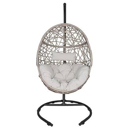 Sunnydaze Decor Caroline Resin Wicker Indoor Outdoor Hanging Egg Patio Lounge Chair With Stand And Beige Cushions